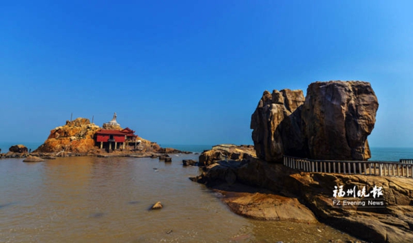 长乐文武砂海域十七孔围垦堤坝的东北隅,有一处傲岸独立的礁岛——王母礁。礁上有两块天然巨石耸立如帆,地方文献记载为“双帆石”,俗称“铁锤铁铛”。王母礁上尚留600余年的妈祖神龛,供奉着一尊装饰华丽的妈祖金身。在礁岛的最高处,伫立着一座高达8米的妈祖石雕巨像。