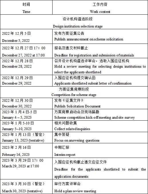 本次征集活动包括“设计机构遴选”“方案征集竞赛”两个阶段。由业主单位委托代理单位召开设计机构遴选评审会,从符合要求的应征机构中择优选出5家入围应征机构,参与第二阶段方案设计。