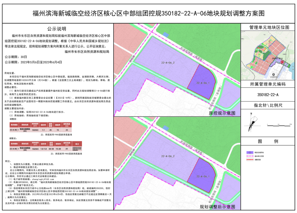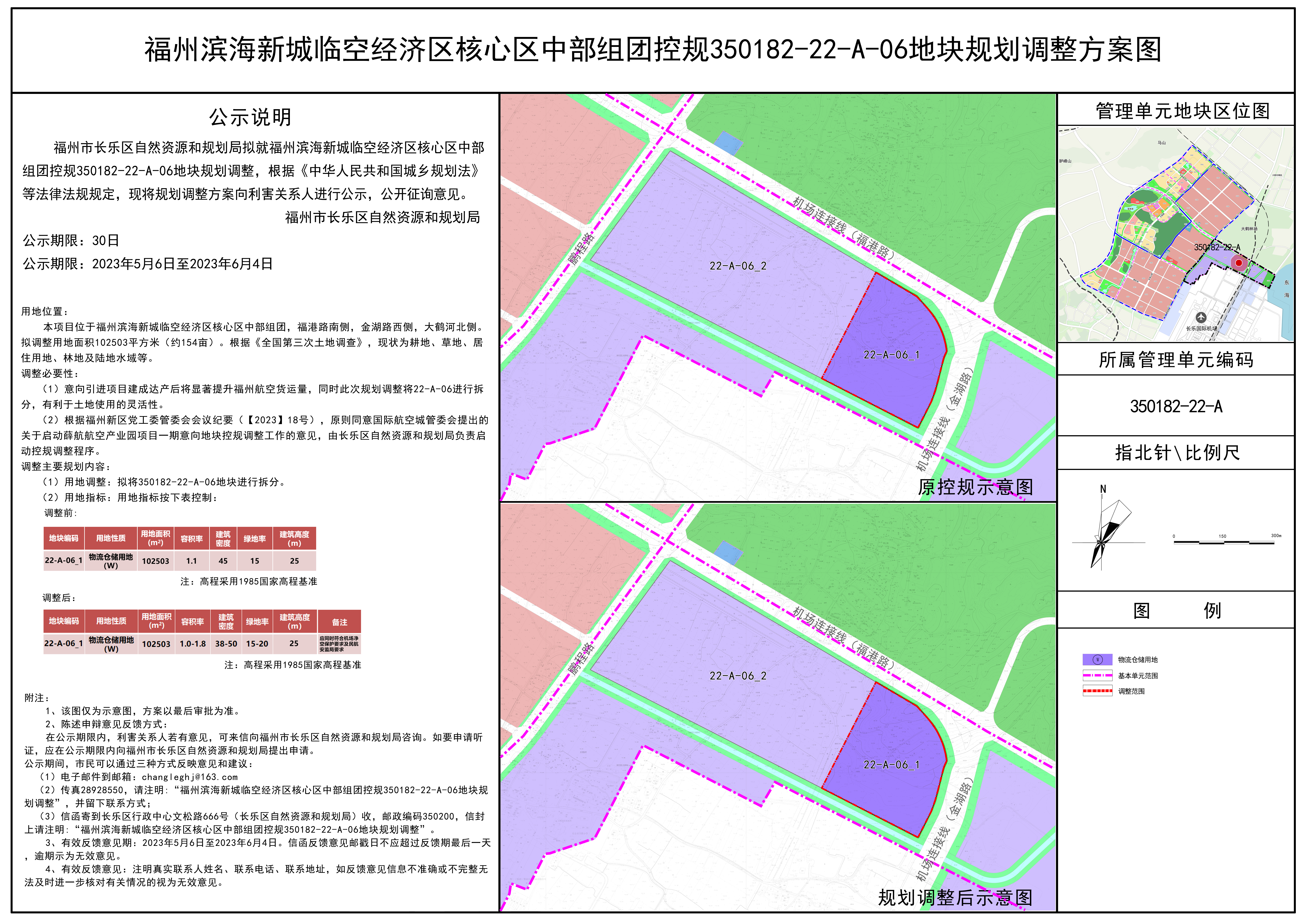 3、信函寄到长乐区行政中心文松路666号(长乐区自然资源和规划局)收,邮政编码350200,信封上请注明“福州滨海新城临空经济区核心区中部组团控规350182-22-A-06地块规划调整方案意见”。