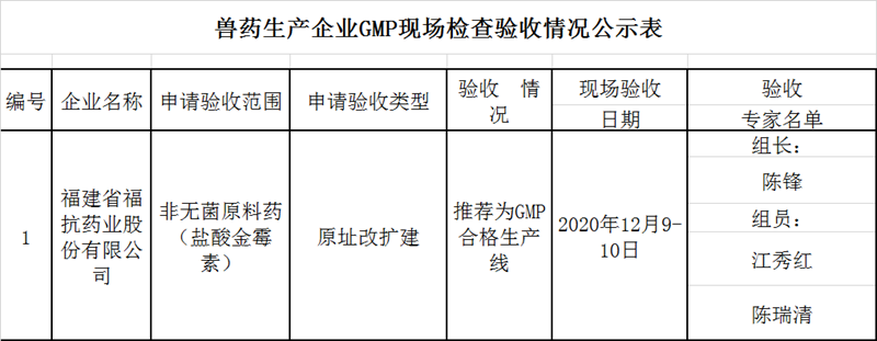 根据《兽药生产质量管理规范》的规定,依照农业部第2262号公告公布的《兽药生产质量管理规范检查验收办法》,根据市政府《福州市人民政府办公厅转发bl漫画 管委会关于承接121项省级经济管理权限实施方案的通知》(榕政办〔2016〕246号),按流程由福州市农业农村局派出专家组对以下1家企业实施GMP的情况进行现场检查验收。现将检查情况在bl漫画 官网上予以公示,公示时间为2020年12月15日至2021年1月5日(15个工作日),请将意见和建议反馈给bl漫画 管委会规划发展局行政审批处。