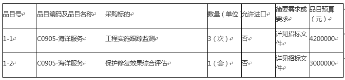 (1)明细:资质条件描述:(1)投标人具有中国国家认证认可监督管理委员会颁发的《检验检测机构资质认定证书》,认定的项目应包括海洋水文、海洋气象、海水水质、沉积物、海洋生态(浮游植物、浮游动物、底栖生物、鱼卵稚仔鱼或鱼类浮游生物、游泳动物)、生物体质量。须提供证明材料复印件并加盖公章; (2)持有测绘地理信息行政主管部门颁发的丙级(含)以上测绘资质证书,测绘资质专业范围为包含有水深测量、海岸地形测量等海洋测绘专业,须提供证明材料复印件并加盖公章; (3)投标人拟派本工程项目的项目负责人须为投标单位本企事业在职人员,应持有合格有效正规管理部门颁发的海洋环境监检测资格证书。