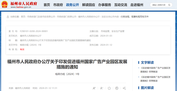 (二十七)本措施自2024年1月1日起实施,有效期3年。《福州市人民政府办公厅关于促进福建海西国家广告产业园区发展的若干意见》(榕政办〔2020〕104号)同时废止。本措施由市市场监管局、市财政局负责解释。