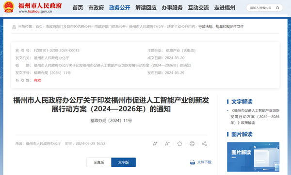 福州市人民政府办公厅关于印发福州市促进人工智能产业创新发展行动方案(2024—2026年)的通知