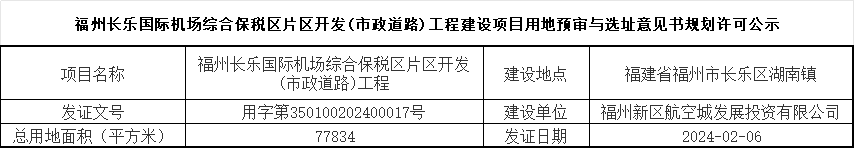 福州长乐国际机场综合保税区片区开发(市政道路)工程建设项目用地预审与选址意见书规划许可公示