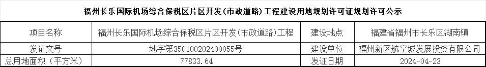 福州长乐国际机场综合保税区片区开发(市政道路)工程建设用地规划许可证规划许可公示
