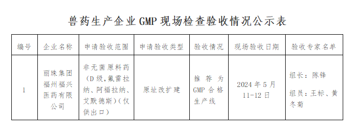 根据《兽药生产质量管理规范》的规定,依照农业部第2262号公告公布的《兽药生产质量管理规范检查验收办法》,根据市政府《福州市人民政府办公厅转发bl漫画 管委会关于承接121项省级经济管理权限实施方案的通知》(榕政办〔2016〕246号),按流程由福州市农业农村局派出专家组对以下1家企业实施GMP的情况进行现场检查验收。现将检查情况在bl漫画 官网上予以公示,公示时间为2024年7月9日至2024年7月15日,请将意见和建议反馈给bl漫画 管委会。