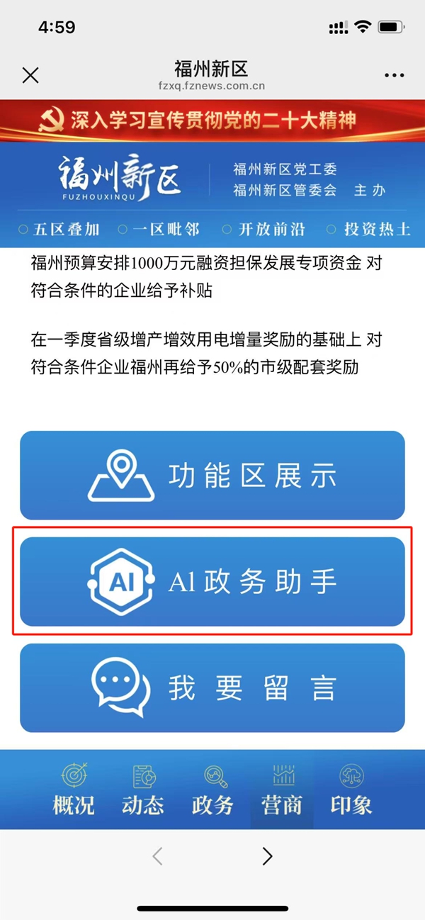 ↑点击“新区要闻”-“营商环境”,在页面下方找到“AI政务助手”。