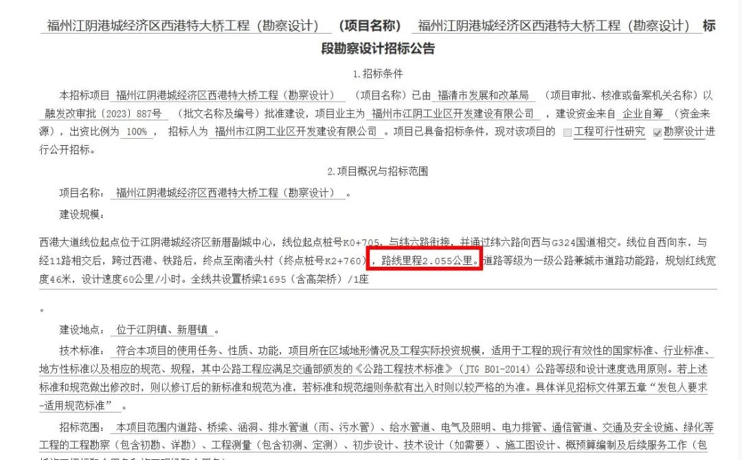 2024年3月8日,福州市公共资源交易服务中心发布“福州江阴港城经济区西港特大桥工程(勘察设计)(项目名称) 福州江阴港城经济区西港特大桥工程(勘察设计)标段勘察设计招标公告”。
