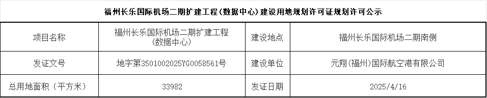 福州长乐国际机场二期扩建工程(数据中心)建设用地规划许可证规划许可公示
