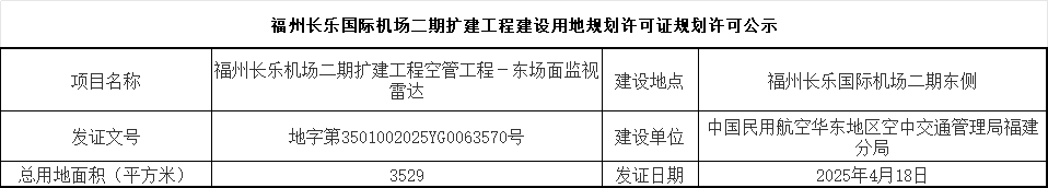 福州长乐机场二期扩建工程空管工程-东场面监视雷达建设用地规划许可证规划许可公示