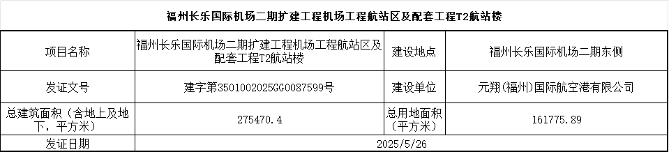 福州长乐国际机场二期扩建工程机场工程航站区及配套工程T2航站楼项目建设工程规划许可证批后公示