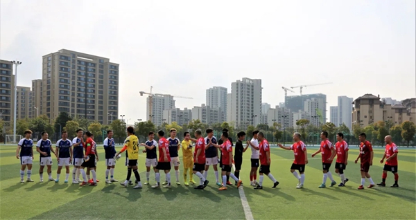 球赛开场前,福建省香港商会足球队和福州市长乐区金刚腿足球队的队员们相互握手,表示友好。