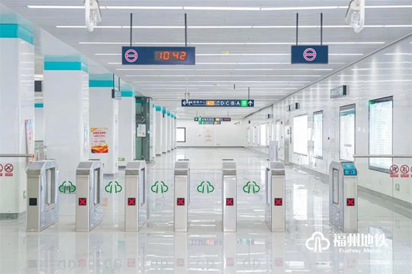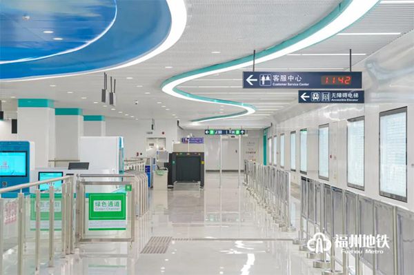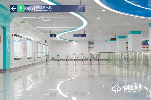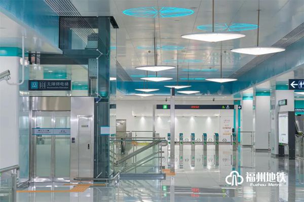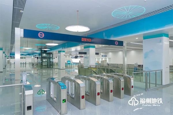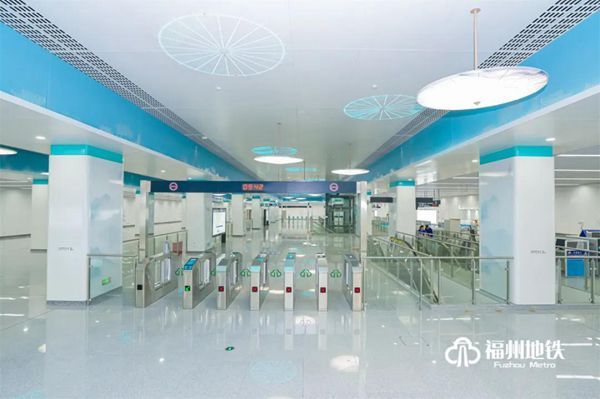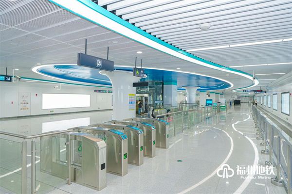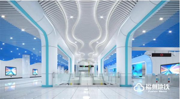 福州火车站为滨海快线第1座车站,也是与1号线换乘的车站,是线路门户站点,设计采用通透式“伞形”结构,在空间吊顶中加入蓝天白云元素,贴合福州特有海丝之路气息。