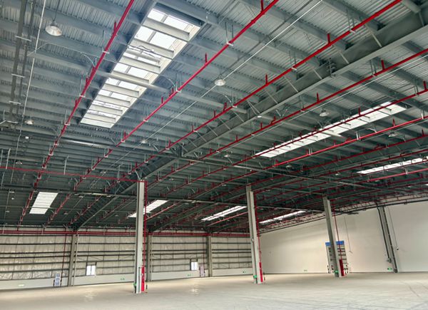 记者来到项目现场看到,分拨中心一区(一期)的1#、3#仓库外观现代大气,银灰色金属板材搭配简洁线条,在阳光下尽显空港物流枢纽的高效质感。走进仓库内部,钢结构屋顶的采光带引入充足自然光,红色消防管道纵横交错,与银灰色的钢梁、吊顶共同构成了工业风十足的作业空间。